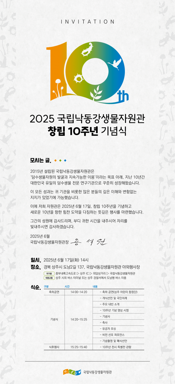 용석원 국립낙동강생물자원관장은 “창립 10주년은 우리 기관이 걸어온 길을 돌아보고 앞으로 나아갈 방향을 함께 모색하는 뜻깊은 이정표”며 “그간의 성과를 바탕으로 담수생물 분야의 전문성과 공공성을 더욱 강화하고 지속가능한 미래를 선도하는 생물자원 전문기관으로 도약하겠다”고 밝혔다.