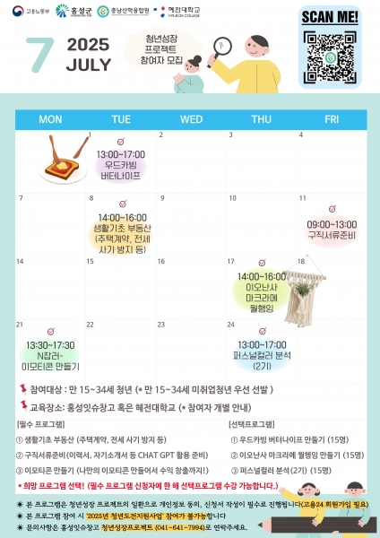 7월에 교육 내용으로는 △우드카빙 버터나이프 만들기 △생활기초 부동산 △챗GPT를 활용한 구직서류 준비하기 △이오난사 마크라메 월행잉 만들기 △나만의 이모티콘 제작 △퍼스널컬러 및 화장품 분석 등 청년들에게 필요하고 관심을 가질 수 있는 다양한 프로그램을 운영할 계획으로 강의는 주로 혜전대학교와 광천읍에 위치한 복합문화창업공간 잇슈창고에서 이루어진다.