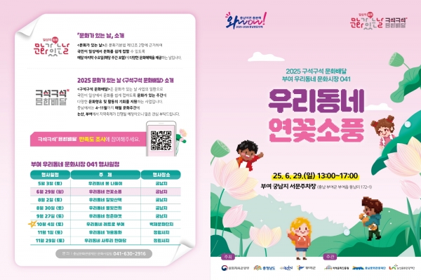 [충청25시] 부여군은 오는 29일 일요일 오후 1시부터 5시까지 궁남지 서문 주차장에서 ‘2025 문화가 있는 날 구석구석 문화배달’ 2회차 행사를 개최한다.