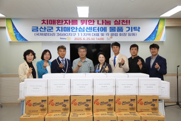 [충청25시] 국제로타리 3680지구 11지역은 지난 25일 금산군치매안심센터에서 지역사회 치매환자 지원을 위해 150만원 상당 김·미역·라면 등 생활필수품을 기탁했다.