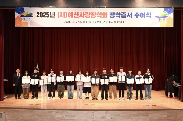 [충청25시] 예산군은 지난 6월 27일 군청 추사홀에서 예산사랑장학회가 2025년도 장학생 장학증서 수여식을 개최하고 관내외 중·고등학생 및 대학생 총 250명에게 장학증서를 전달했다고 1일 밝혔다.