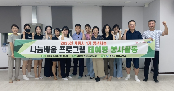 [충청25시] 계룡시는 지난 30일 평생학습 프로그램 ‘스포츠 테이핑’ 강좌 수료생과 강사가 함께 근육과 관절 통증을 겪고 있는 지역 주민을 대상으로 테이핑 봉사활동을 펼쳤다고 전했다.