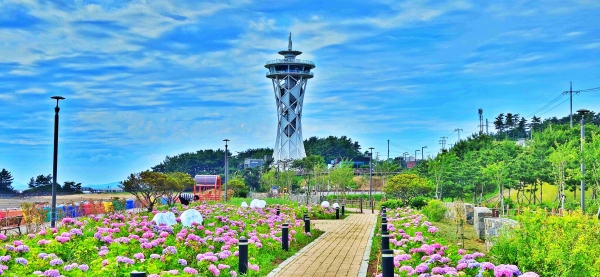 속동해안공원은 여름철 수국과 라벤더가 만개하는 정원형 관광지로 향기와 색감이 어우러진 몰입형 꽃 정원으로 조성돼 있다.