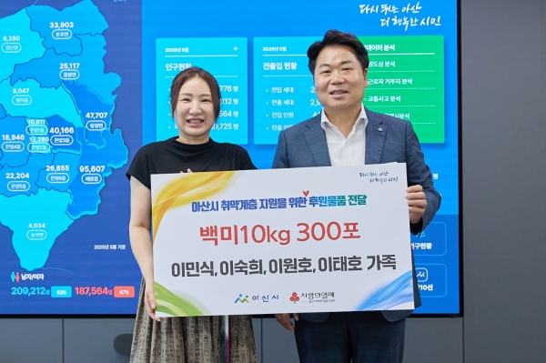 [충청25시] 아산시는 2일 이숙희 씨 가족이 취약계층을 위해 백미 10kg 300포를 전달했다고 밝혔다.