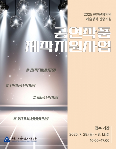 [충청25시] 천안문화재단(대표이사 안동순, 이하 재단)은 오는 8월 1일까지 ‘공연작품 제작지원사업’ 지원단체를 모집한다고 4일 밝혔다.