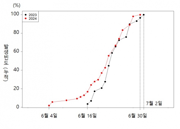 분석 결과, 올해 러브버그의 최초 발생 시기는 전년도보다 약 일주일 늦어졌으며 이에 따라 활동 종료 시점도 늦춰질 것으로 전망됐다.