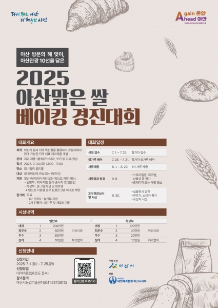 [충청25시] 아산시는 ‘아산 방문의 해’를 맞아 ‘아산관광 10선’과 연계해 지역 농산물 소비 촉진과 관광 활성화를 도모하기 위한 ‘2025년 아산맑은 쌀 베이킹 경진대회’ 참가자를 25일까지 모집한다.