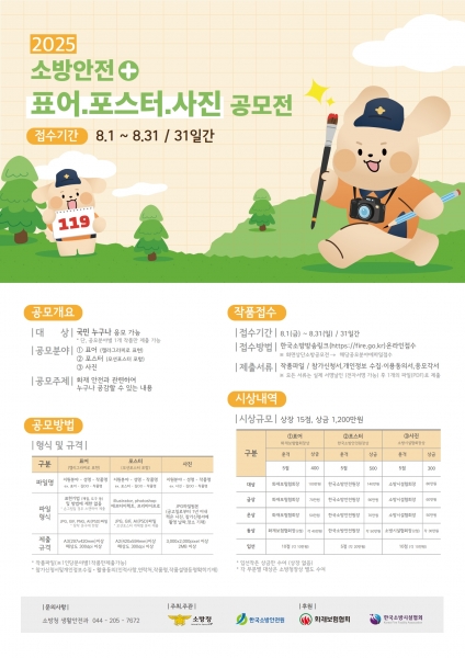 [충청25시] 소방청은 국민과 함께 만드는 안전문화 확산을 위해‘2025년 소방안전 표어·포스터·사진 공모전’을 8월 1일부터 개최한다고 밝혔다.