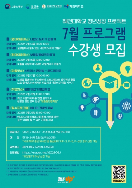 지난 5월부터 추진하고 있는 ‘청년 성장 프로젝트’의 이번 프로그램은 원데이 클래스부터 심리·감성 프로그램, 취업역량 강화 특강까지 총 5개 과정으로 구성되어 있으며 오는 14일부터 29일까지 혜전대학교 내 강의실에서 순차적으로 진행된다.