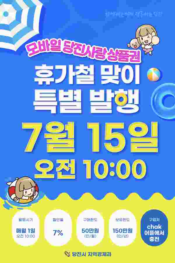 [충청25시] 당진시가 본격적인 휴가철을 맞이해 매월 1회 발행하던 모바일 당진사랑상품권을 7월 한 달간 50억원을 추가로 15일 오전 10시 특별 발행한다.