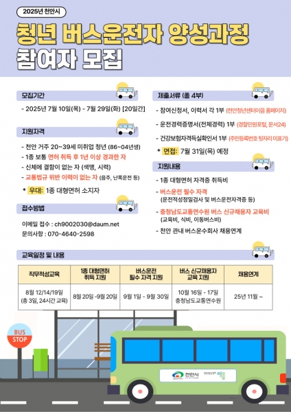 [충청25시] 천안시는 오는 29일까지 ‘2025년 하반기 청년 버스 운전자 양성 프로그램’ 참여자를 모집한다고 밝혔다.