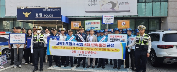 [충청25시] 천안시는 최근 남부오거리와 운동장사거리 일원에서 꼬리물기·끼어들기 등 5대 반칙운전 근절을 위한 교통안전 합동캠페인을 실시했다고 11일 밝혔다.