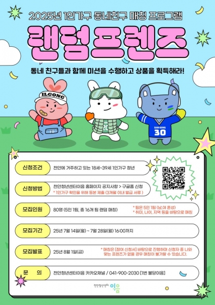[충청25시] 천안시는 천안청년센터 이음이 1인 가구 청년들의 커뮤니티 형성을 위한 동네친구 매칭 프로그램 ‘랜덤프렌즈’ 참여자를 모집한다고 14일 밝혔다.