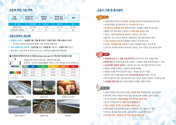 또한. 고온기 가축 질병 관리를 위해 정기적 소독, 해충방제를 실시하고 폐사축 발생 시 즉시 매몰 또는 소각 처리가 필요하며 가축에게는 신선한 물과 비타민, 미네랄을 충분히 급여해 사료 섭취율을 높여 고온 스트레스를 완화해야 한다.