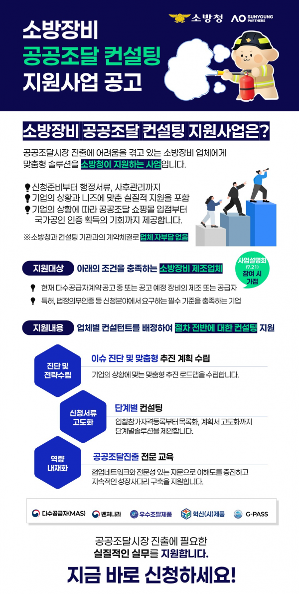 소방청은 올해 최대 30개 업체을 대상으로 해당 컨설팅을 지원할 계획이며 MAS 계약 체결 가능성이 높은 업체를 우선 선정한 뒤, 향후 다양한 조달 시장 진입을 준비 중인 기업으로 점차 확대해 나갈 방침이다.