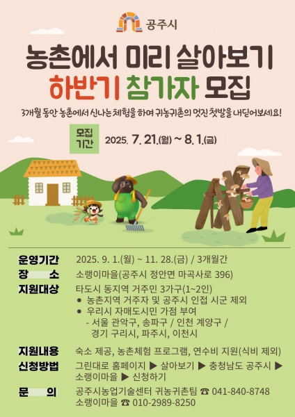 [충청25시] 공주시는 예비 귀농·귀촌인이 농촌 생활을 직접 체험하며 미래를 준비할 수 있도록 돕는 ‘농촌에서 미리 살아보기’ 프로그램의 하반기 참가자를 오는 8월 1일까지 모집한다고 밝혔다.