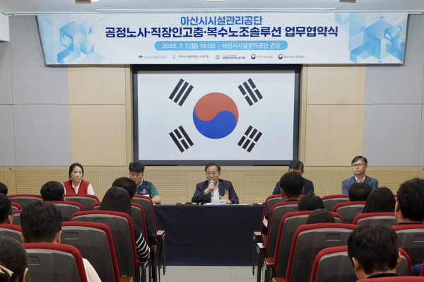 [충청25시] 아산시시설관리공단, 아산시시설관리공단 노동조합, 세종충남지역노동조합 아산시설관리공단지회는 지난 7월 7일 중앙노동위원회, 충남지방노동위원회와 ‘공정노사·복수노조·직장인 고충 솔루션’ 업무협약을 체결했다.