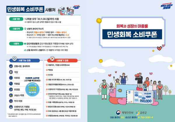 [충청25시] 금산군은 민생 회복과 소비 진작을 위해 전 국민을 대상으로 동시 지급되는 민생회복 소비쿠폰 1차 접수를 7월 21부터 9월 12일까지 진행한다.