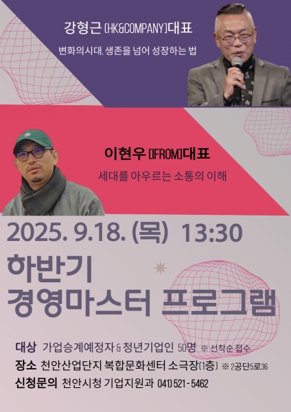 [충청25시] 천안시는 9월 18일 천안산업단지 복합문화센터에서 열리는 ‘하반기 경영마스터 프로그램’ 참여자를 모집한다고 18일 밝혔다.