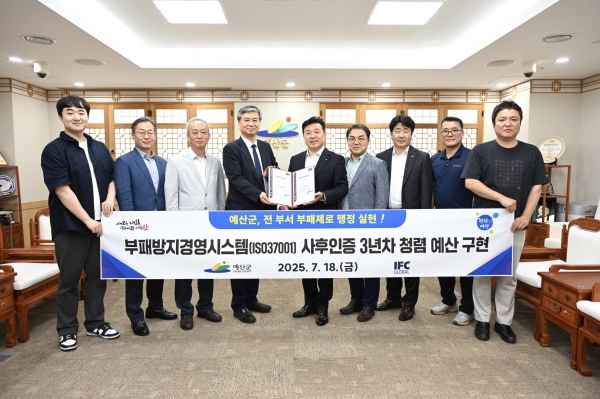 [충청25시] 예산군이 직속기관, 사업소 및 읍면을 포함한 전 부서의 부패방지경영시스템 인증을 성공적으로 유지하며 청렴도 최우수 지방자치단체로서의 위상을 공고히 했다.