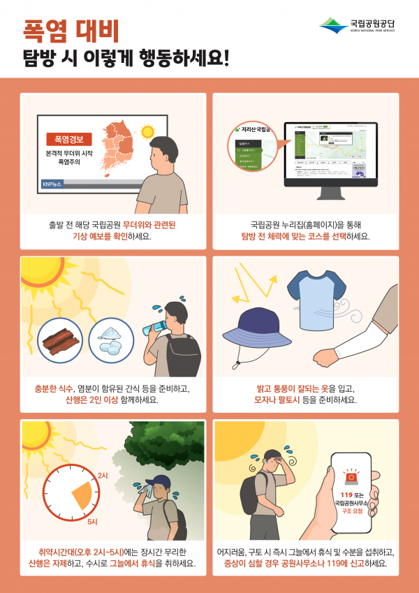 또한, 국립공원공단은 주요 탐방로 입구에 설치된 재해문자전광판 등을 통해 폭염 대비 탐방객 안전수칙을 안내하고 주요 거점시설에 응급 물품을 비치하는 한편 현장직원 순찰을 강화해 폭염 대응에 총력을 기울이고 있다.