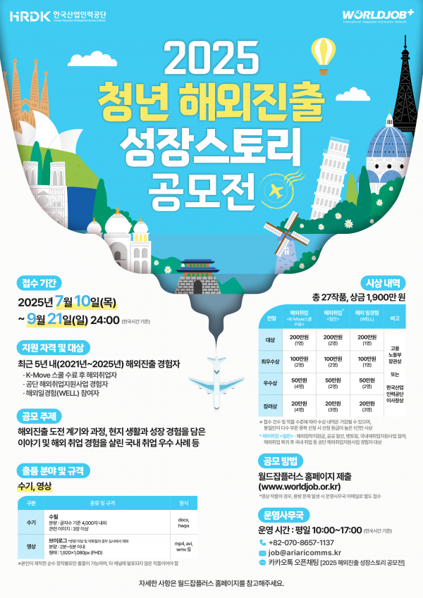 [충청25시] 한국산업인력공단은 해외진출을 경험한 청년들의 도전과 성장을 조명하는 ‘2025년 청년 해외진출 성장스토리 공모전’을 개최한다.