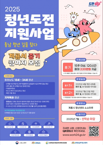 [충청25시] 계룡시와 충청남도는 고용노동부가 주관하는 ‘청년 도전지원사업’ 하반기 프로그램 참여자를 추가 모집한다고 밝혔다.