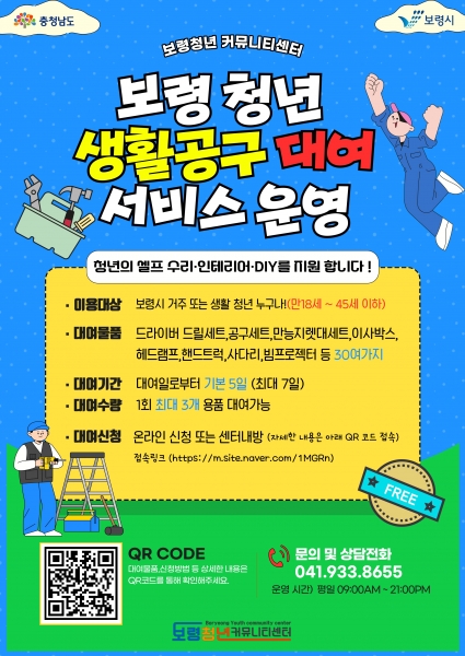 한편 청년 생활공구 무상 대여사업 관련 자세한 사항은 보령시청 누리집 공고문을 확인하거나 보령청년커뮤니티센터에 문의하면 된다.