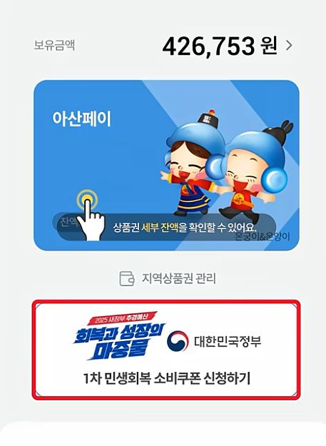 우선 지역화폐 chak 어플을 다운로드하고 아산페이 앱에 접속하면, ‘1차 민생회복 소비쿠폰 신청하기’ 가 메인 화면에 노출돼 있다.