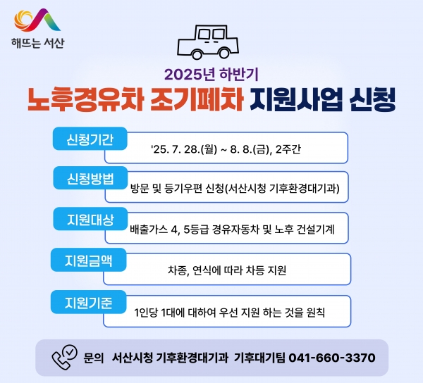 신청을 원하는 지원 대상 차량 소유자는 서산시청 제2청사에 있는 기후환경대기과에 방문하거나 등기우편으로 하면 된다.