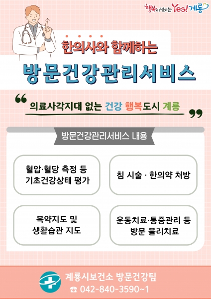 [충청25시] 계룡시는 거동이 불편하거나 근골격계 질환으로 통증을 호소하는 시민들을 지원하기 위해 ‘한의사와 함께하는 방문건강관리서비스’를 새롭게 선보인다.