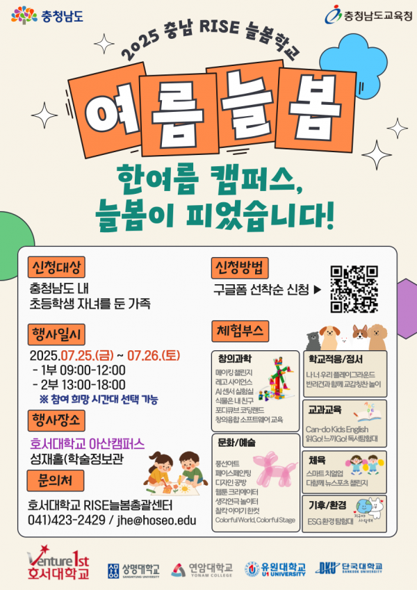 특히 호서대, 상명대, 유원대, 단국대, 연암대 등 지역 5개 대학이 공동으로 준비한 'RISE 늘봄 프로그램'은 인공지능 코딩, 환경·사회·투명 경영 환경 탐험, 스포츠 도전잇기, 웹툰 크리에이터, 독서 탐험 등 20여 개 체험공간을 운영하며 교수진과 전문 강사진이 직접 참여해 학부모와 학생들의 눈높이에 맞춘 실질적인 체험을 제공할 예정이다.