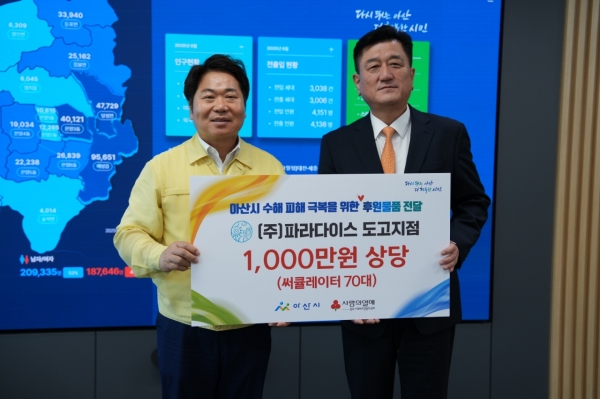 [충청25시] 아산시는 파라다이스 스파 도고로부터 최근 집중호우로 피해를 입은 이재민들을 위한 1,000만원 상당의 써큘레이터 70대를 후원받았다.