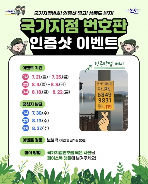 이번 이벤트는 7월 21일부터 8월 22일까지 총 3차에 걸쳐 격주로 진행되며 논산시 전역에 설치된 국가지점번호판과 함께 사진을 찍어 논산시 공식 페이스북에 인증 댓글을 작성해 응모할 수 있다.