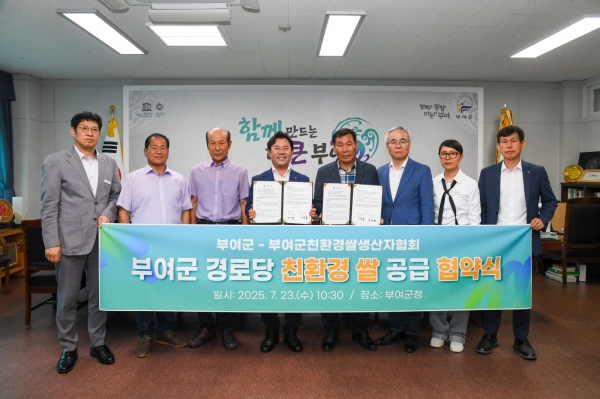 [충청25시] 부여군은 어르신들의 건강한 급식을 지원하고 지역 농가와의 상생을 도모하기 위해 지난 23일 ㈜부여군친환경쌀생산자협회 농업회사법인과 '경로당 친환경 쌀 공급' 업무 협약을 체결했다.