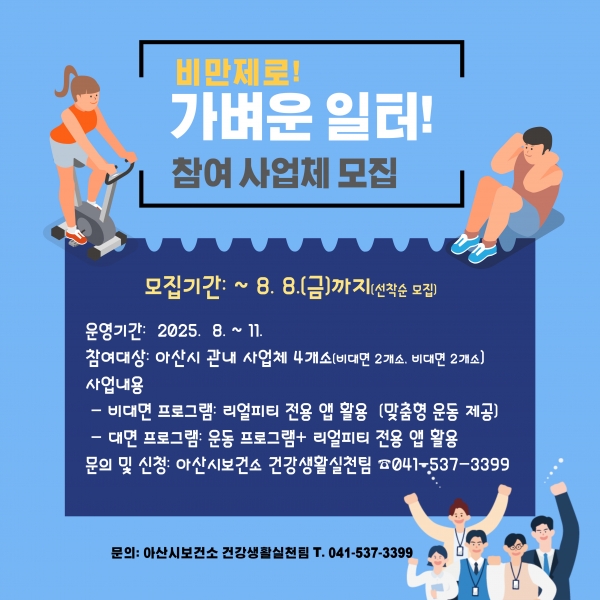 [충청25시] 아산시가 근로자의 건강한 일터 조성을 위해 ‘비만 제로 가벼운 일터’ 참여 사업체를 오는 8월 8일까지 모집한다.