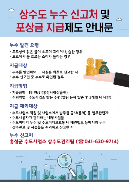 누수 사실을 최초로 신고한 사람에게는 실제 누수로 확인된 경우 지급대상자 알림문자가 발송되며 홍성사랑상품권 1만원이 포상금으로 지급된다.
