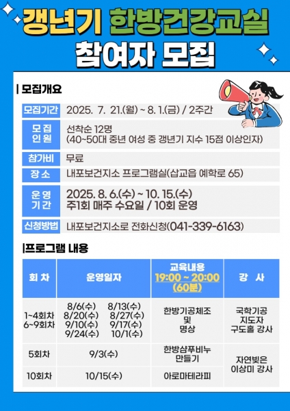 [충청25시] 예산군 내포보건지소는 2025년 하반기 갱년기 한방건강교실 참여자 12명을 선착순 모집한다고 밝혔다.