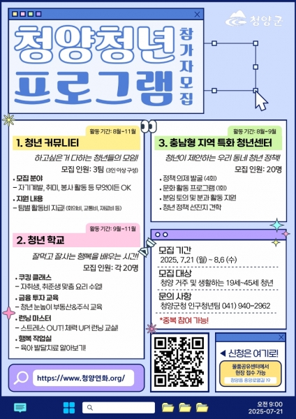 [충청25시] 청양군은 지역 청년들의 소통과 성장을 지원하고 청년들이 직접 지역문제를 고민하며 정책을 제안할 수 있도록 돕는 다양한 참여 프로그램을 8월부터 본격 추진한다고 밝혔다.