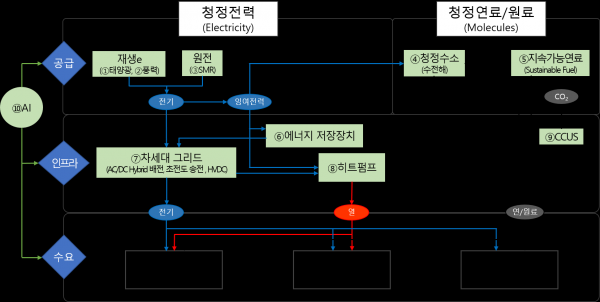 세부적으로 ➊청정전력 중심의 전기화 확대를 지원하는 태양광, 해상풍력의 경쟁력 강화와 SMR 등 차세대 원자력의 초격차 달성을 위한 방안과 ➋전기화가 어려운 일부 수송 및 산업공정에 대해 청정수소, 지속가능연료와 같은 청정연료 전환 방안에 대해 검토할 계획이다.