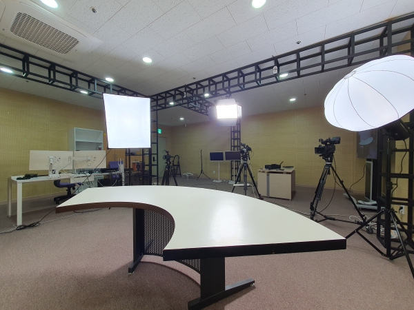 최근 리모델링한 콘텐츠 제작실은 1~2인이 출연하는 영상 제작에 최적화된 소규모 공간으로 주변 소음이 차단된 안정적인 촬영 환경과 온라인 강의 영상을 송출할 수 있는 시설을 구비하고 있다.