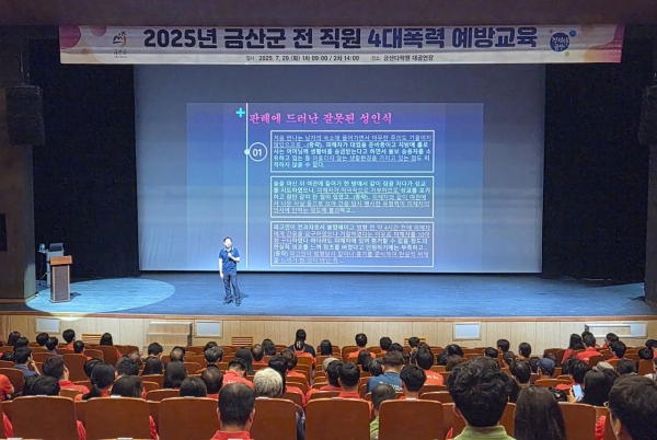 [충청25시] 금산군은 지난 29일 금산다락원 생명의집 대공연장에서 직장 내 폭력 예방과 성평등한 조직문화 조성을 위해 전 직원 대상 직장 내 성희롱·성폭력·성매매·가정폭력 등 4대 폭력 예방 교육을 전개했다.