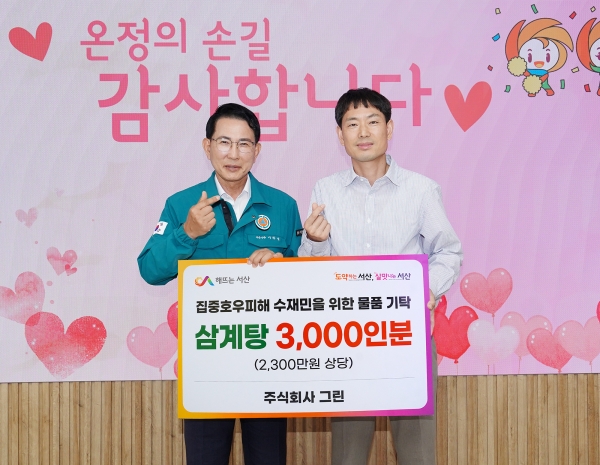 이완섭 서산시장은 “지역 사회를 향한 따스한 관심에 감사드리며 이번 전달될 삼계탕이 집중호우로 피해를 본 시민에게 큰 위로가 되길 바란다”고 말했다