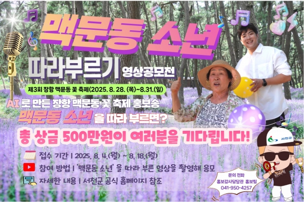 [충청25시] 서천군이 제3회 장항 맥문동 꽃 축제를 맞아 AI 홍보송 ‘맥문동 소년’ 따라부르기 영상공모전을 개최한다.