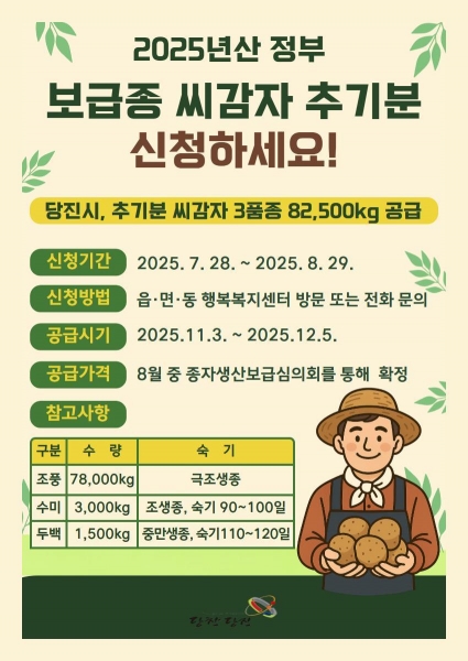 [충청25시] 당진시농업기술센터는 농민들의 소득 증가와 안정적인 감자 생산 기반 마련을 위해 8월 29일까지 2025년산 정부 보급종 씨감자 추기분 신청을 받는다고 1일 밝혔다.