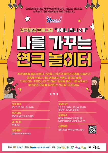 연극 체험 프로그램 대한 자세한 내용은 배방어울림문화센터 누리집, 블로그, 인스타그램에서 확인할 수 있으며 신청은 QR코드, 전화, 방문을 통해 가능하다.