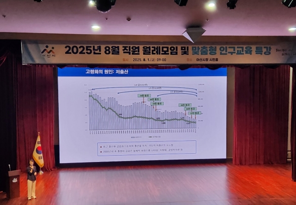 [충청25시] 아산시가 ‘인구구조 변화와 우리의 미래’라는 주제로 인구와미래정책연구원 유수연 강사를 초청해 전 직원 ‘맞춤형 인구교육’을 실시했다.