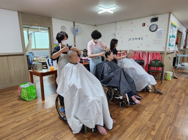 [충청25시] 아산교육지원청 소속 봉사동아리 ‘행복울림 온결’은 8월 4일 오전, 무지개동산요양원을 방문해 미용 봉사활동을 실시했다.