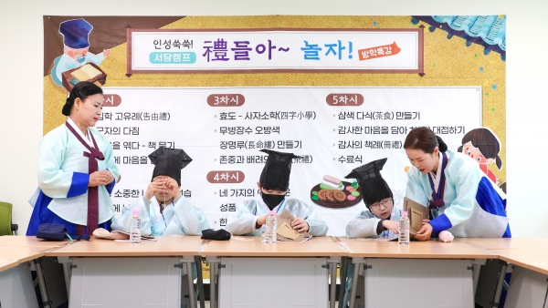 [충청25시] 대전평생학습관 예절교육지원센터는 오는 8월 5일부터 7일까지 초등학교 4~6학년 학생 15명을 대상으로 자아존중 및 사회성 증진을 위한 체험형 인성교육 프로그램인‘인성쑥쑥 서당캠프’를 운영한다고 밝혔다.