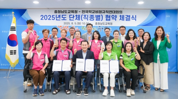 [충청25시] 충남교육청은 2025년 8월 5일 도교육청 회의실에서 전국학교비정규직연대회의와 단체 협약을 체결했다.